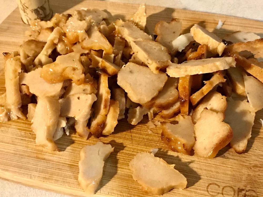 1 rounded c. Delight Soy chicken nuggets (mine were Teriyaki flavored), thinly sliced