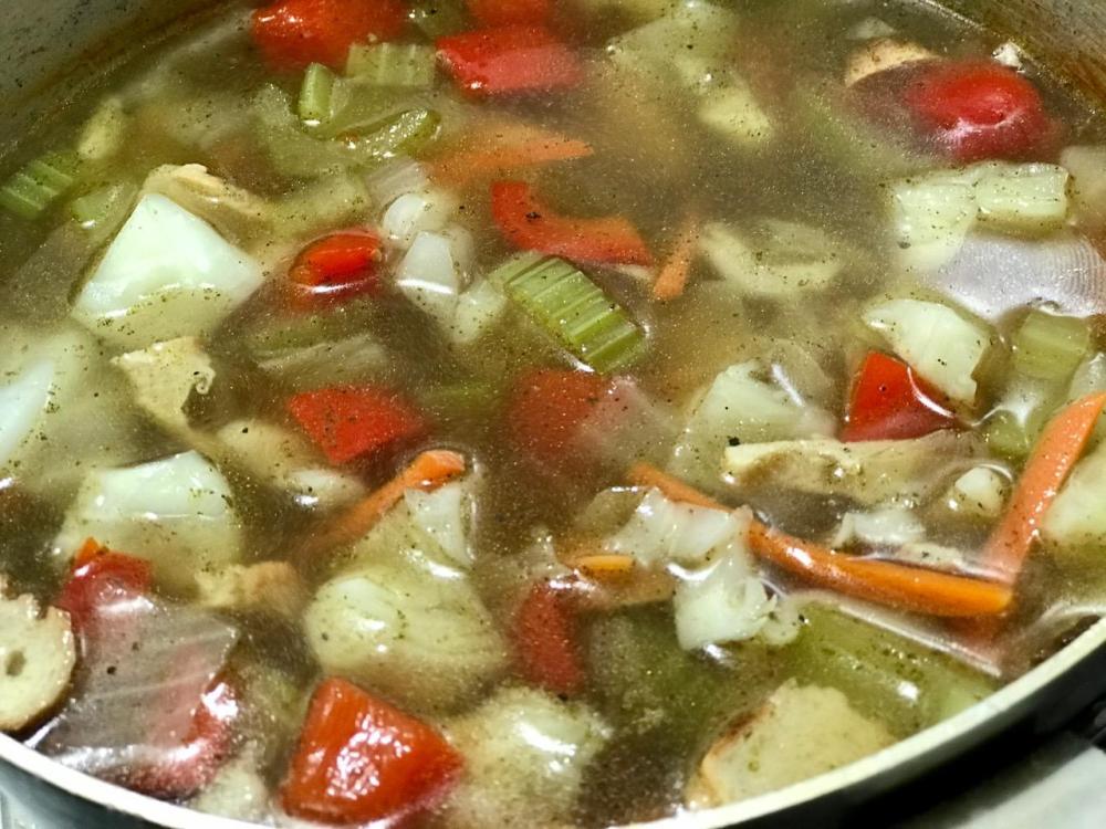 In large saucepan place water, celery, red pepper, onion, salt, poultry seasoning, bouillon and black pepper. Bring to boil, reduce heat to low and cook till tender.