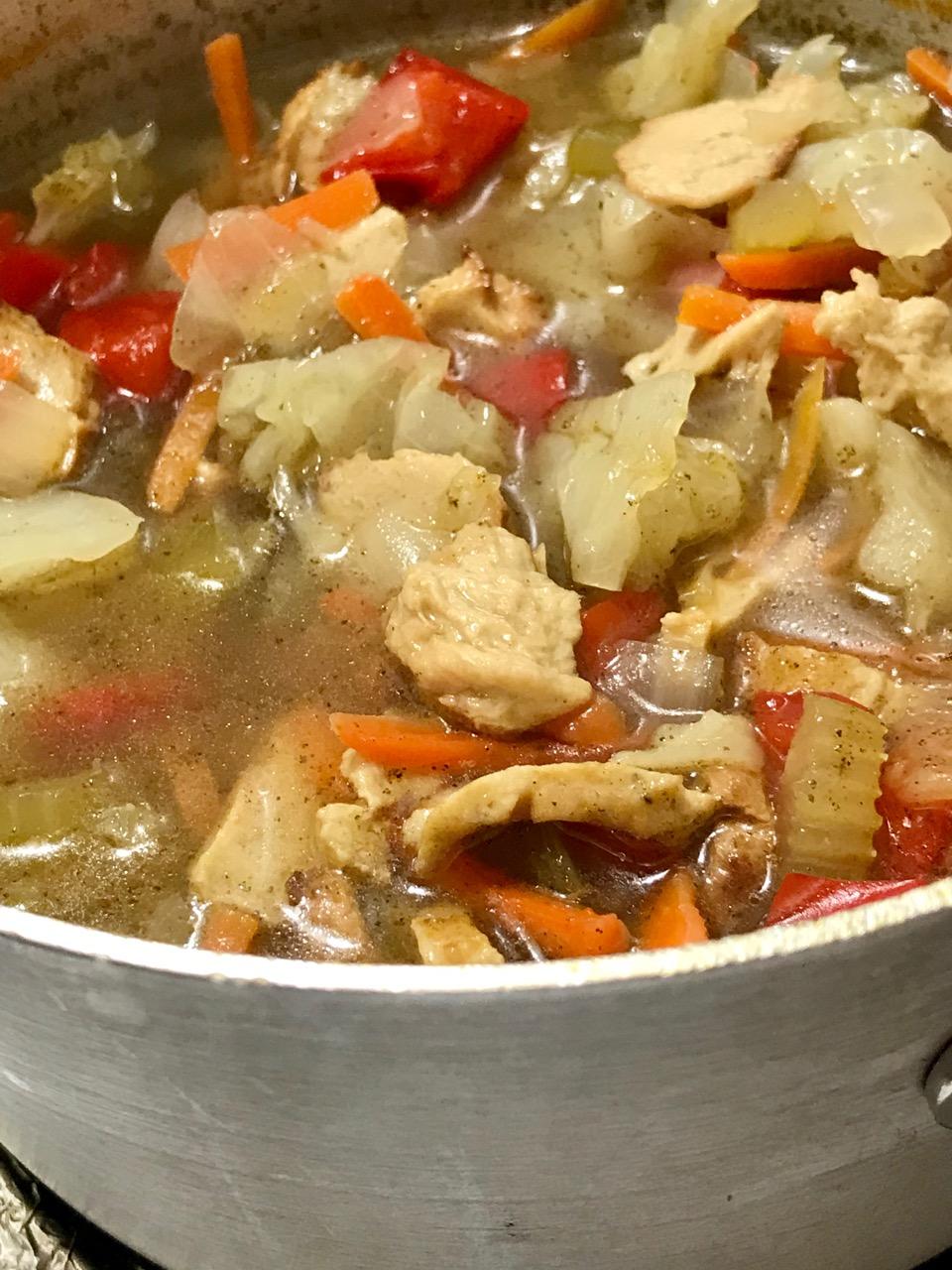 Add cabbage, sliced Delight Soy nuggets and carrot matchsticks. Stir, then cook nuggets until soft, about 15 minutes or more. Remove from heat.