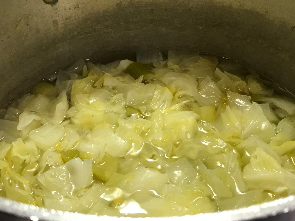 Combine all cabbage soup ingredients, except olive oil, margarine, sesame oil (which we’ll add at the end), in extra-large pot. Turn heat to medium-high, bring to slow boil, cover and cook 10 minutes.