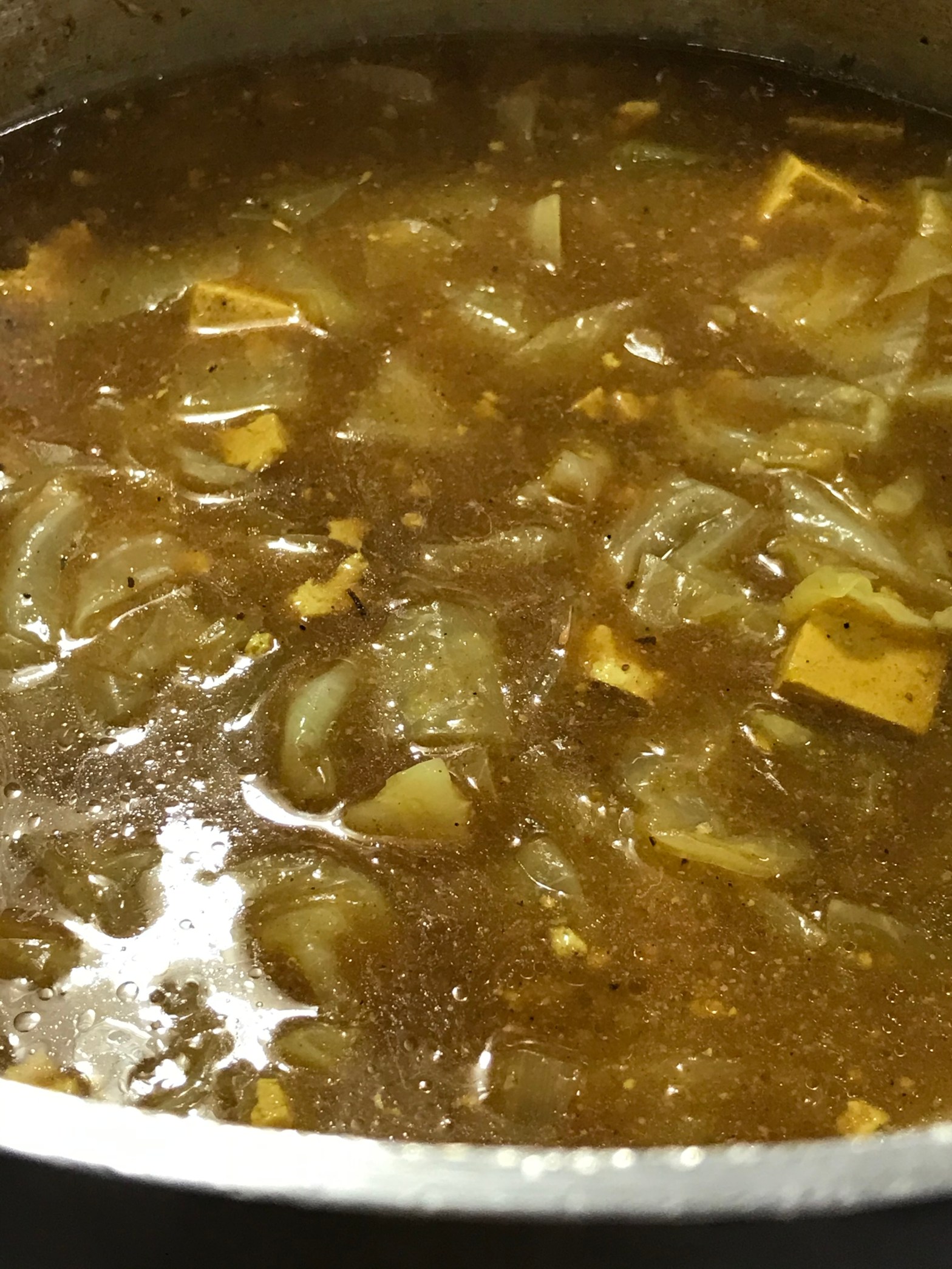 Combine all cabbage soup ingredients, except olive oil, margarine, sesame oil (which we’ll add at the end), in extra-large pot. Turn heat to medium-high, bring to slow boil, cover and cook 10 minutes.