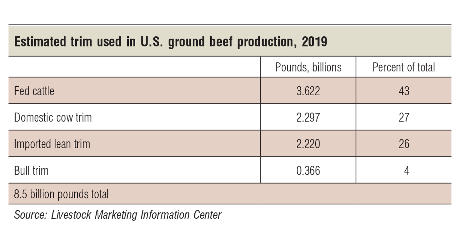 First, the Livestock Marketing Information Center estimates total beef trim used in the U.S. last year at 8.5 billion pounds (see graphic). Of that, 27% (2.3 billion pounds) was from domestic beef and dairy cows; another 26% (2.2 billion pounds) was imported trim.