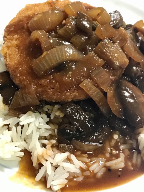 Serve over vegan burgers, vegan chicken, pasta or rice. This evening I pan-fried MorningStar Original CHICK PATTIES and steamed some Jasmine Rice. I served in this sequence: rice, gravy, chick pattie, more gravy.