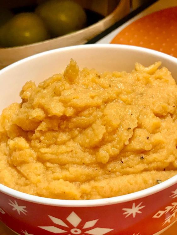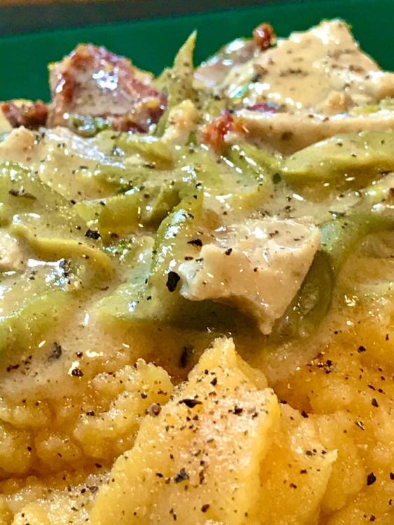 Tofurky Plant Chick’n simmered in a SILK CREAMY CASHEW SAUCE with French Style Green Beans and marinated sun-dried tomato strips seasoned with garlic, tarragon and soft sweet onion. Served over PUMPKIN TATER MASH! Lovely!!