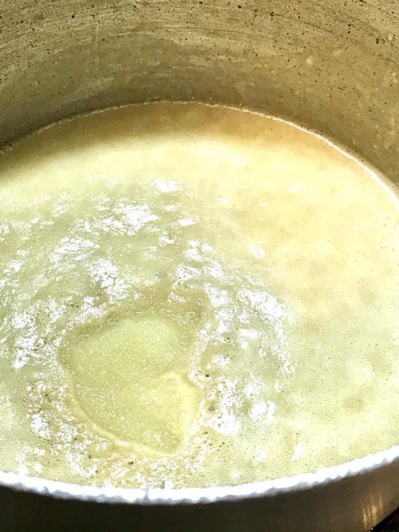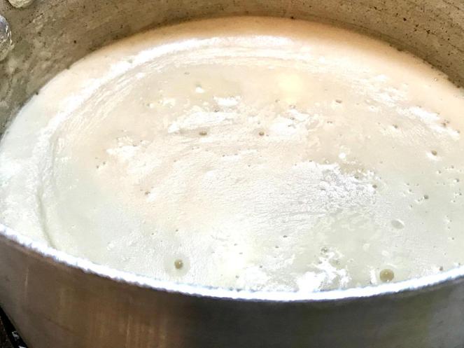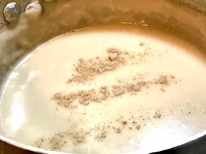 3- Add salt and pepper. Lower heat as needed to prevent scorching, whisking all the while – about 5 minutes, taking short breaks to do something else, but don’t leave the kitchen and check often. Since we’re making a white sauce, we don’t want it to darken too much.