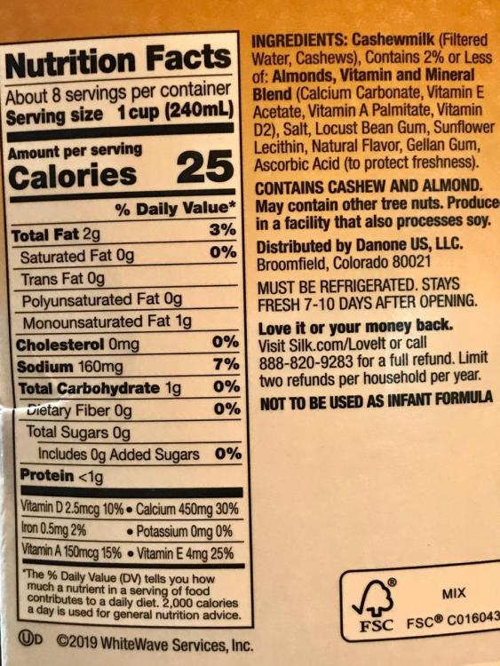 4 c. SILK CREAMY CASHEW UNSWEETENED 25 calories per 8 oz.
