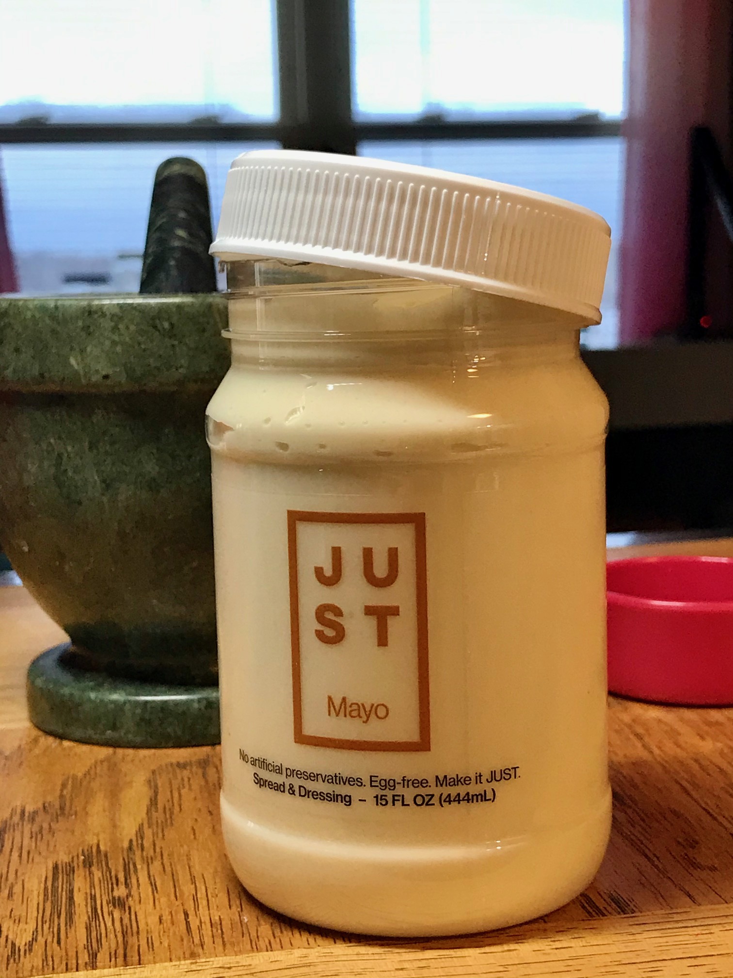 Unfortunately for me, since I love to try different flavors, out of all the flavors JUST, Inc. claims to sell I’ve only seen the original and chipotle. I tried the squeeze bottle, but recently happened upon the jar packaging and found it much more convenient. There’s a lot of waste in squeeze mayo bottles whereby the serving size is difficult to determine when a big glob shoots out all at once – way more than needed. So how do you put it back in the bottle? You don’t.