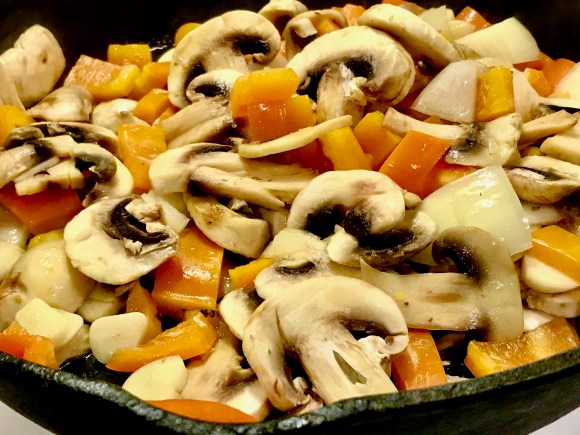 Add mushroom, onion, yellow pepper, salt and black pepper. Stir to coat with oil, then saute till veggies begin to sweat their waters.