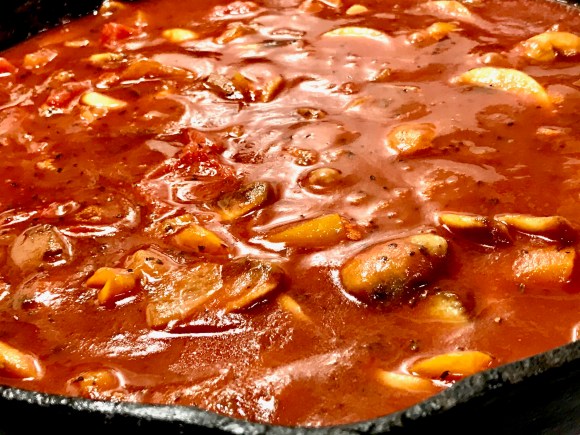 MUTTI Tomato Puree with basil meets Chef Sharon’s Holy Trinity of mushroom, onions, and peppers . A little peach juice, extra virgin olive oil, more basil, sliced garlic a little smoke – and WOW!