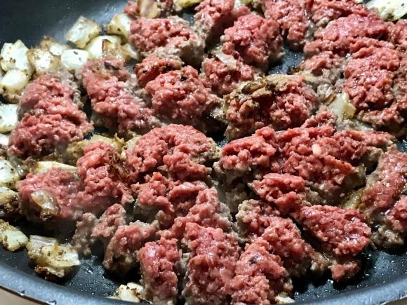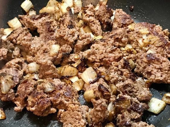 3- Add whole block of Impossible Burger meat. Using spatula or wide spoon break apart in the skillet just like you would do with hamburg. Evenly disperse in skillet and let cook on one side till browned.