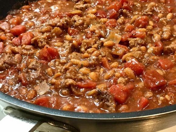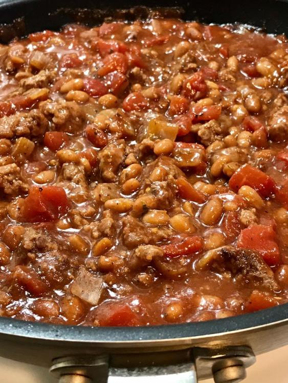 An easy to make tasty skillet dish with burgers, beans and tomatoes. Serve plain or over rice, potatoes or pasta.