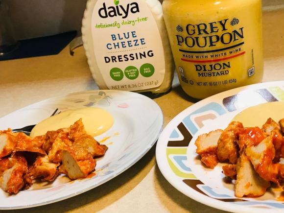 2- Combine Daiya Blue Cheeze Dressing and Poupon Dijon Mustard in cup, using equal parts, or more or less of one or the other – in other words, to your tastes. I liked half and half.