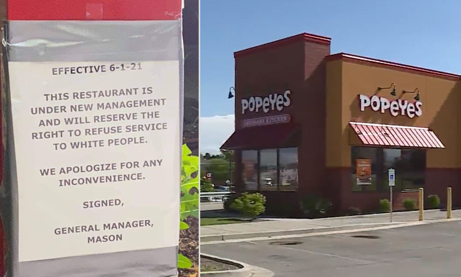 RE: Sign Posted at a St. Louis Popeyes Denies White People of The Good Chicken Service Posted bysharonleedaviestight06/03/202106/06/2021Posted inNET NEWS, POPEYE'STags:BLACK LIVES TERRORISTS, CHICKEN FAST FOOD, FBI, HATE CRIMES, POPEYE'S, RACISM, REFUSE SERVICE TO WHITE PEOPLE