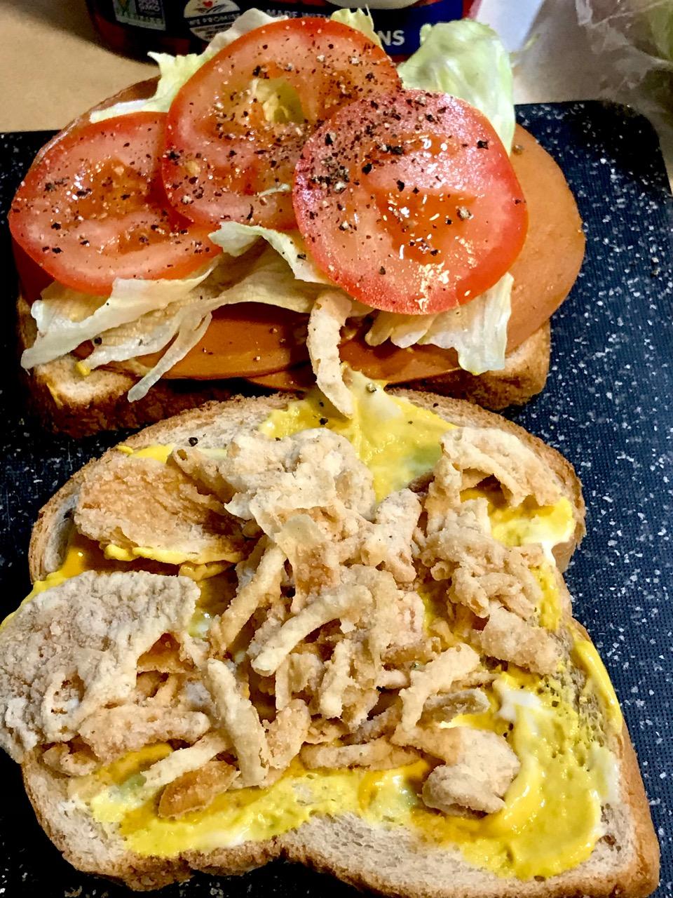 2- On one bread mound CRISPY FRIED ONIONS.