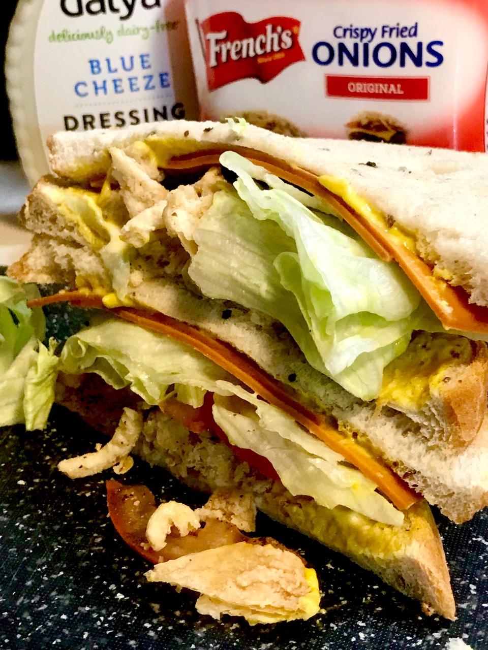 Make any veggie sandwich extraordinary with CRISPY FRIED ONIONS by French’s, Veggie Bacon by Yves and Blue Cheeze Dressing by daiya! Make sure the bread is fresh (lightly toasted if you like), the lettuce is crisp and the tomatoes ripe! You hit the Trifecta!