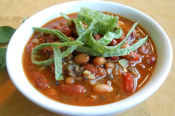 Reheat chili and adjust for salt. Ladle into soup bowls. Wrap spinach tortilla strips around fingers, then place decoratively on top of chili. Drizzle each serving with a little extra virgin olive oil; sprinkle with freshly ground black pepper and serve.
