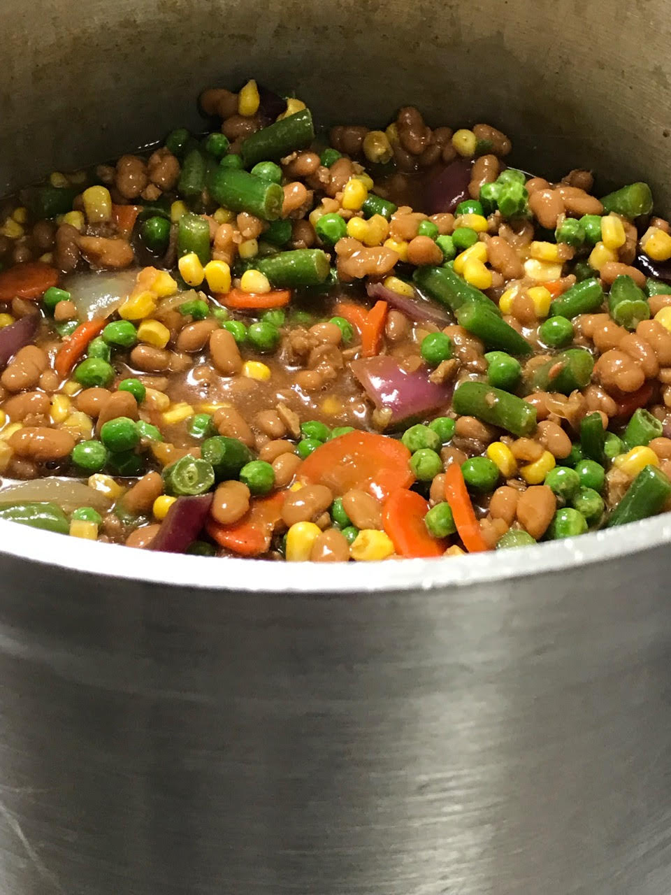 A hearty pot of baked beans and veggies. Smoky, sweet, salty, spicy, acidic. Textured with reconstituted vegetable protein to increase nutritional content and uptick the chew factor. You don’t need ground pork or bacon with these beans. The textured vegetable protein sauteed with seasonings create the chew and flavor you expect!