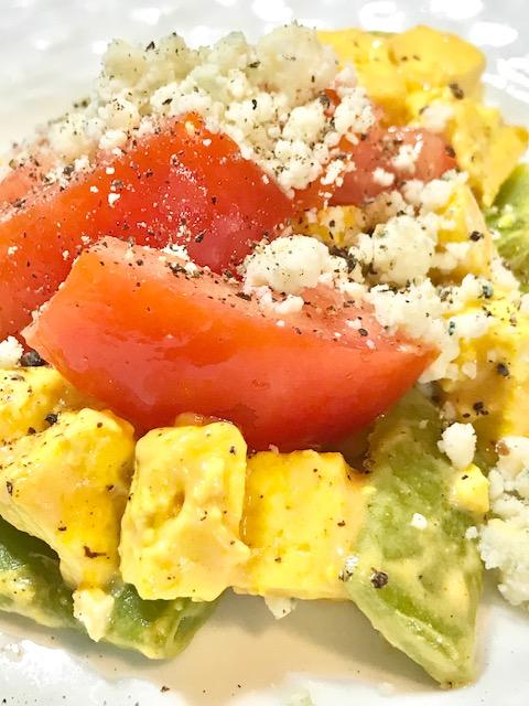 7- Plate individual servings of tofu/beans, top with diced tomatoes and crumbled A-F bleu cheeze.
