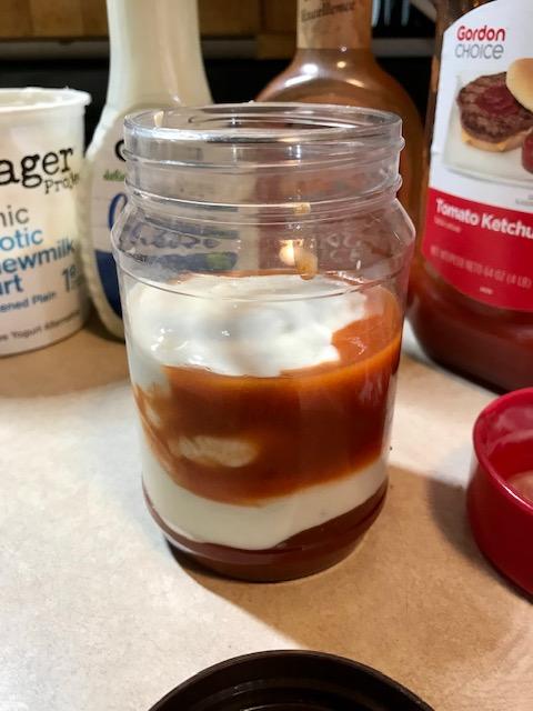 1- Combine all ingredients in jar, screw on top and shake vigorously till sauce turns an even salmon color.