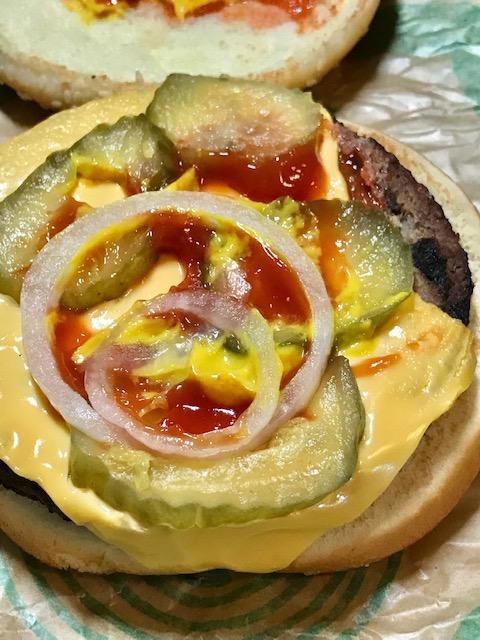Steve brought home two IMPOSSIBLE KING BURGERS – one with cheese, one without. His and Hers. One Impossible burger on a bun with mustard, ketchup, onion, pickle.
