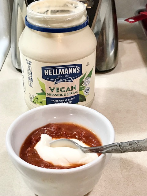 Simply use your favorite jarred marinara sauce and add Hellman’s Vegan mayo to it, as desired, doesn’t take much, stir to make evenly creamy – a beautiful salmon color.