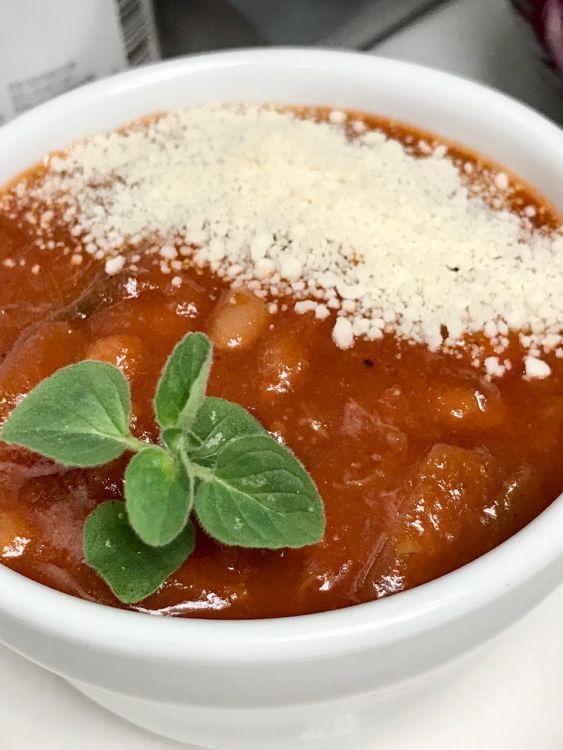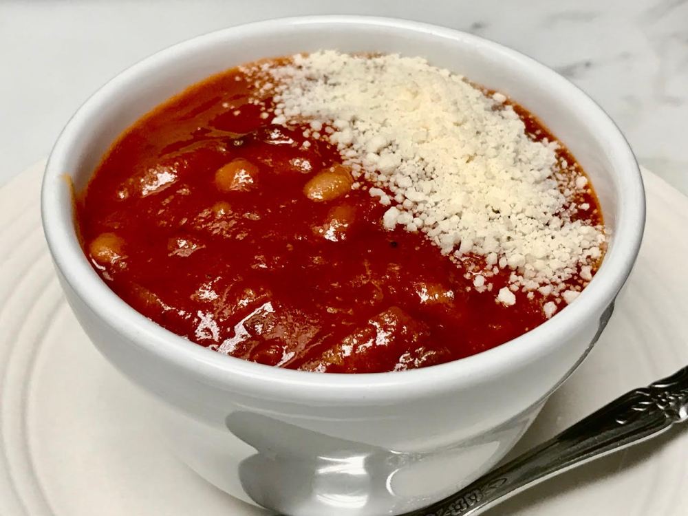 3_ Serve Saucy Tomato Bean Soup alone in soup bowls with or without animal-free shaker parmesan cheese – I used Follow Your Heart brand, or serve over individual plates of the pasta.