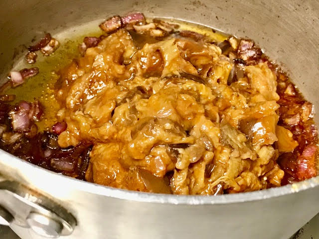 It’s Steve’s birthday today and he wanted to start another weight loss program, so didn’t want to go out to eat and didn’t want me to cook, but I decided to make him a red and greasy as he calls it, anyway, since he’d probably change his mind – and he did! I added a few tricks such as a beautiful canned fried eggplant. And here it is.