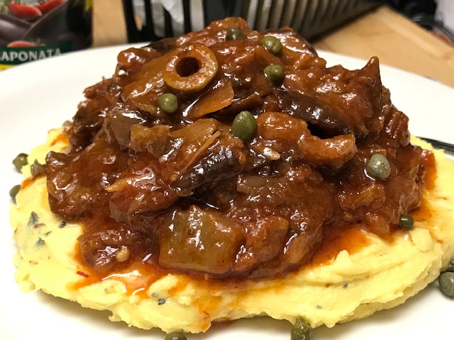 Topped with Eggplant Caponata and Capers. Chef Sharon establishing new traditions within the animal-free culinary world of the GOAT experience!