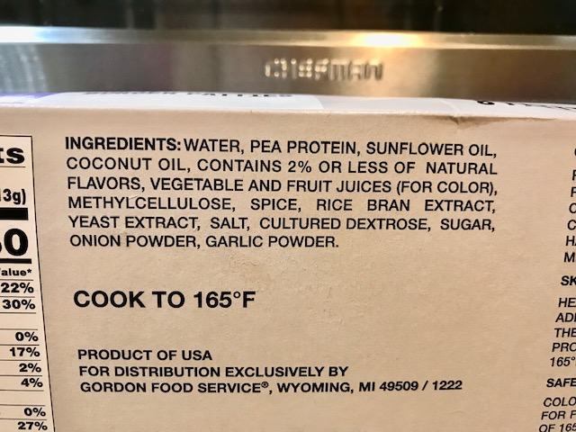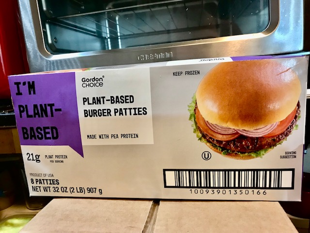 Gordon Plant-Based Patties – Made With Pea Protein. Eight PATTIES to a box NET WT 32 oz. (2 pounds). And guess what? There’s a Gordon’s near where I live in Florida, just like Cleveland, only Cleveland’s GORDON store was right across the street. This GORDON’s is an UBER ride away. I can order online, still I have to pay an UBER to deliver it and that’s pricy.